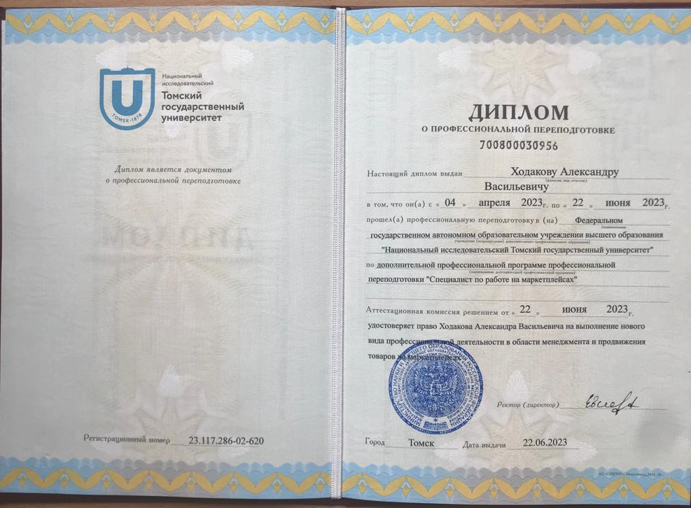 Диплом о прохождении обучения по специальности "Специалист по работе на маркетплейсах" в Томском Государственном Университете, выдан 22 июня 2023 года. Сертификат Академии Нейросетей объединения ТЕРРА выдан 10 ноября 2025 года.